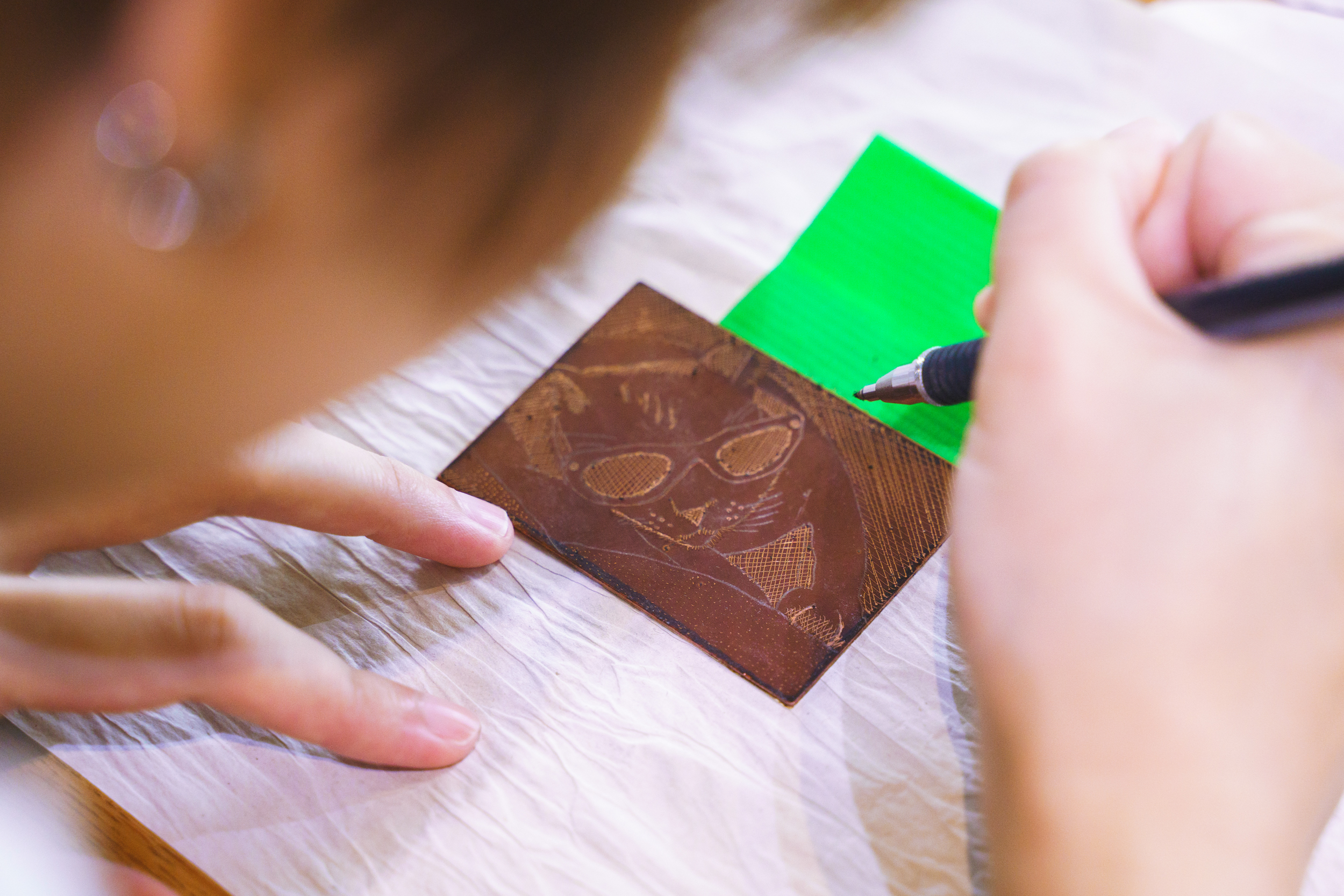 銅を腐蝕させて版を作る「エッチング」という技法を使って、基本的な銅版画制作の手順を体験できるワークショップです。